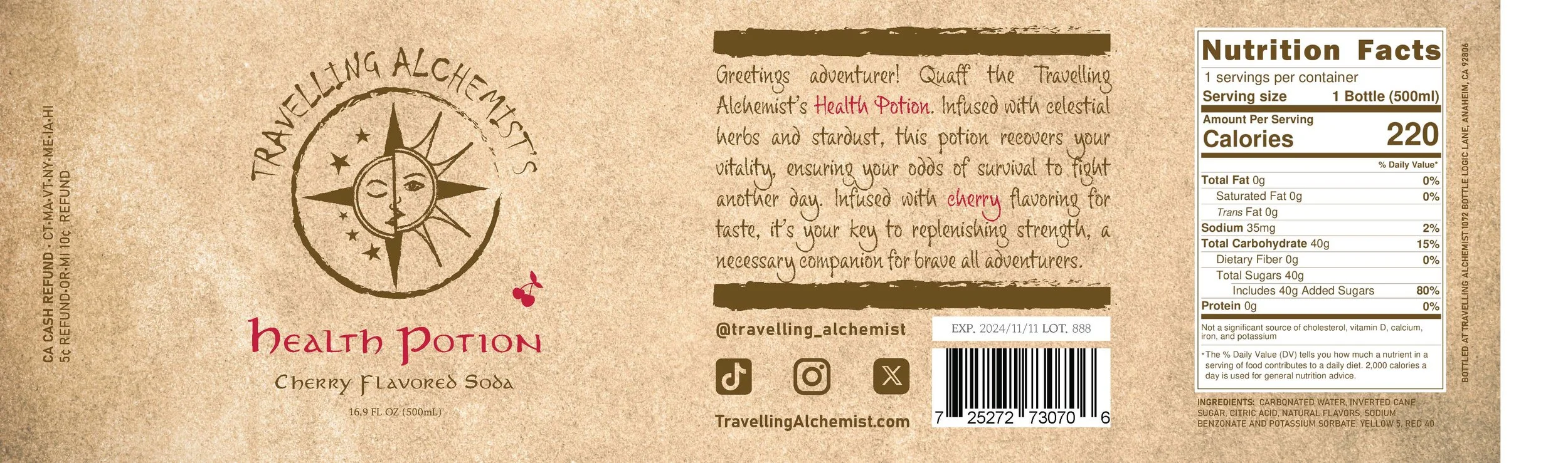 This project involved branding and packaging design for a fictitious brand, Traveling Alchemist’s, which offers products inspired by fantasy RPG elements. The specific product in focus was a line of soft drinks, each representing a different potion: cherry for health, blue raspberry for mana, and green apple for stamina.